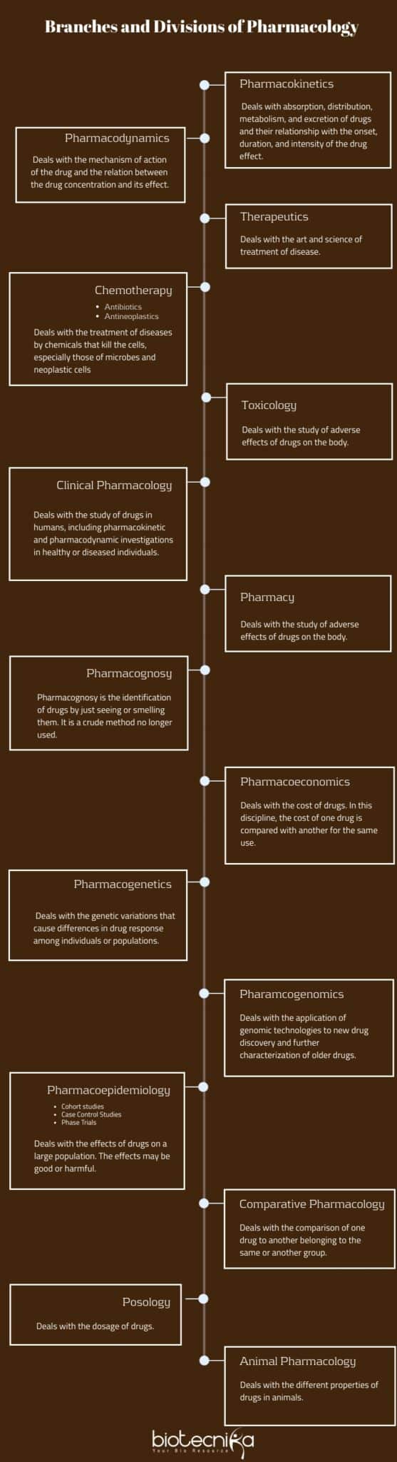 There are 2 major fields of pharmacology – pharmacodynamics, and pharmacokinetics. Pharmacodynamics is the study of the impacts of medicines on biological systems, and Pharmacokinetics is the study of the impacts of biological systems on medicines.