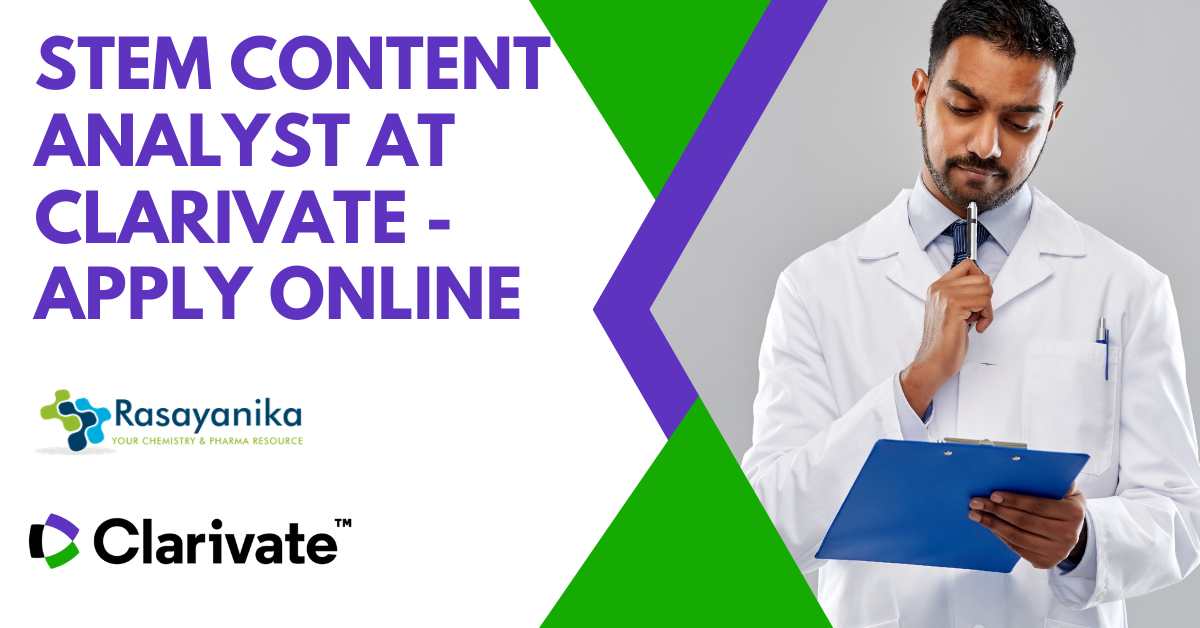Keywords: Content Analyst, STEM, Chemistry, Life Sciences, Healthcare, Remote, Hybrid, Job Opportunity, Chennai, Patents, Journals, Drug Discovery Intelligence. STEM Content Analyst at Clarivate – Apply Online. Subscribe to Rasayanika for the latest chemistry and Pharma job openings, follow us on Facebook and Telegram and subscribe to our youtube channel for the latest updates on chemistry and Pharma jobs and much more.