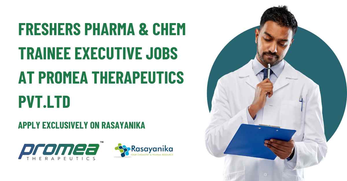 Keywords: Freshers Pharma & Chem Trainee Executive Jobs at Promea Therapeutics Pvt.Ltd, Apply Exclusively on Rasayanika. Subscribe to Rasayanika for the latest chemistry and Pharma job openings, follow us on Facebook and Telegram and subscribe to our youtube channel for the latest updates on chemistry and Pharma jobs and much more.