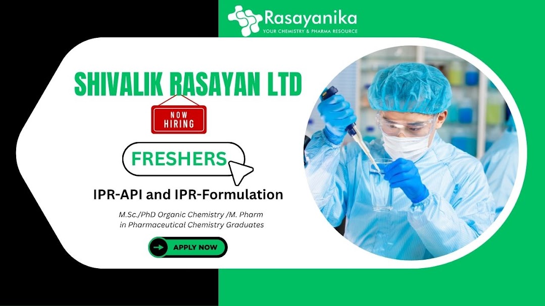 Shivalik Rasayan is hiring for IPR – API and IPR – Formulation positions in Bhiwadi, Rajasthan. Ideal candidates are M.Sc/PhD graduates in Organic Chemistry or M. Pharm with strong technical knowledge. Join a dynamic team to support patent filing, IP strategy, and pharmaceutical innovation in both API and formulation domains.