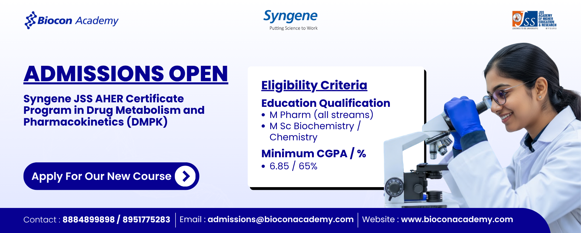 Biocon Academy with Syngene International partners with JSS Academy of Higher Education and Research (formerly JSS University), a leading institute of higher education and a deemed-to-be university recognized by the MHRD and accredited by NAAC with an A+ grade, to deliver a first-of-its-kind Certificate Program in Drug Metabolism and Pharmacokinetics (DMPK).
