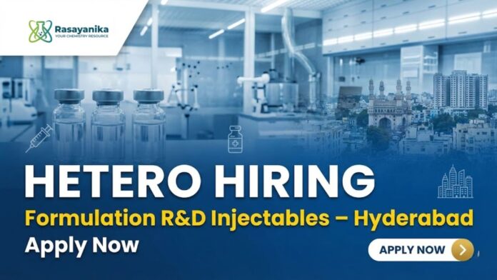 R&D Jobs at Hetero. They are hiring for a permanent Formulation Research & Development (FRD) – Injectables role at its Apuroopa facility in Hyderabad. This opportunity is ideal for professionals with 1–3 years of experience in injectable formulation development who are keen to work on parenteral dosage forms within a regulated pharmaceutical R&D environment. Interested candidates apply for the exciting opportunity at Hetero Careers.
