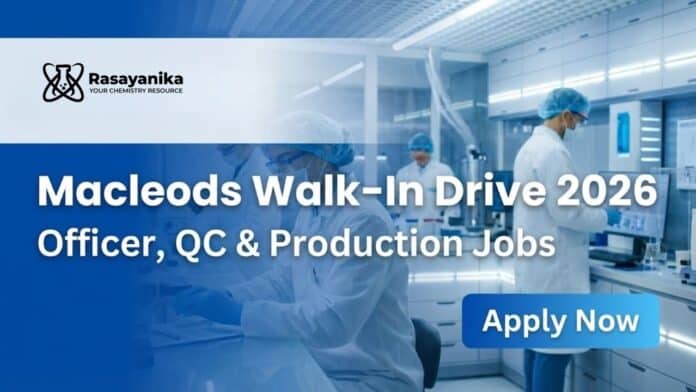 Looking for MSc Chemistry Jobs or Organic Chemistry Jobs in the pharmaceutical industry? Macleods Pharmaceuticals is conducting a walk-in drive at Chhatrapati Sambhaji Nagar for Officer Jobs in Quality Control and Production. Candidates with M.Sc Chemistry, B.Pharm, or M.Pharm can gain hands-on experience in analytical validation, stability studies, API manufacturing, dry powder injection, and formulation operations. This is a great opportunity for professionals seeking long-term careers in production jobs and quality-focused roles in a GMP-compliant pharmaceutical company.
