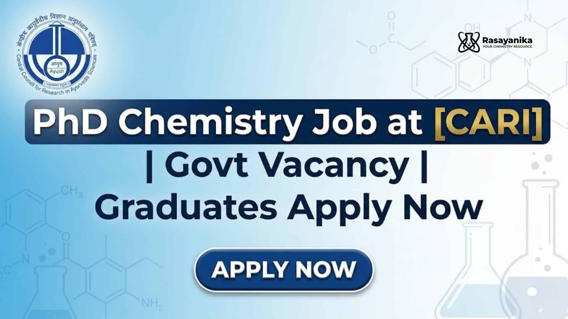 This PhD Chemistry Job offers an excellent platform for researchers interested in pharmaceutical and chemistry-based research in government institutes. Working at CARI provides exposure to advanced analytical instrumentation, research publications, and interdisciplinary research in Ayurveda and pharmaceutical sciences.